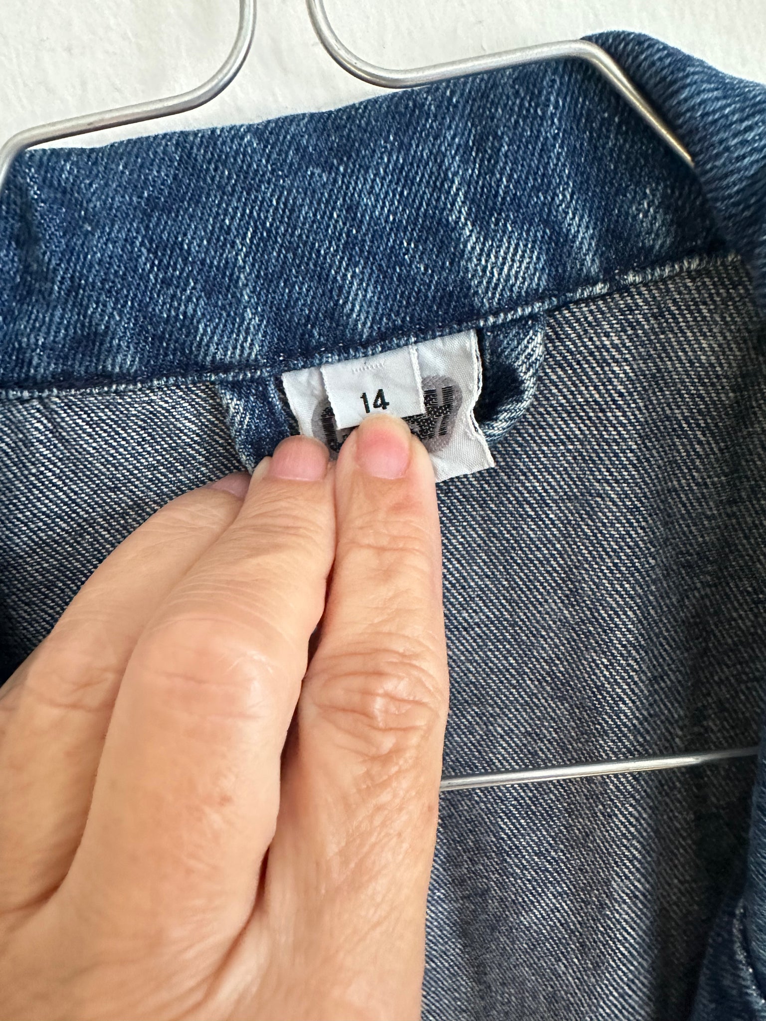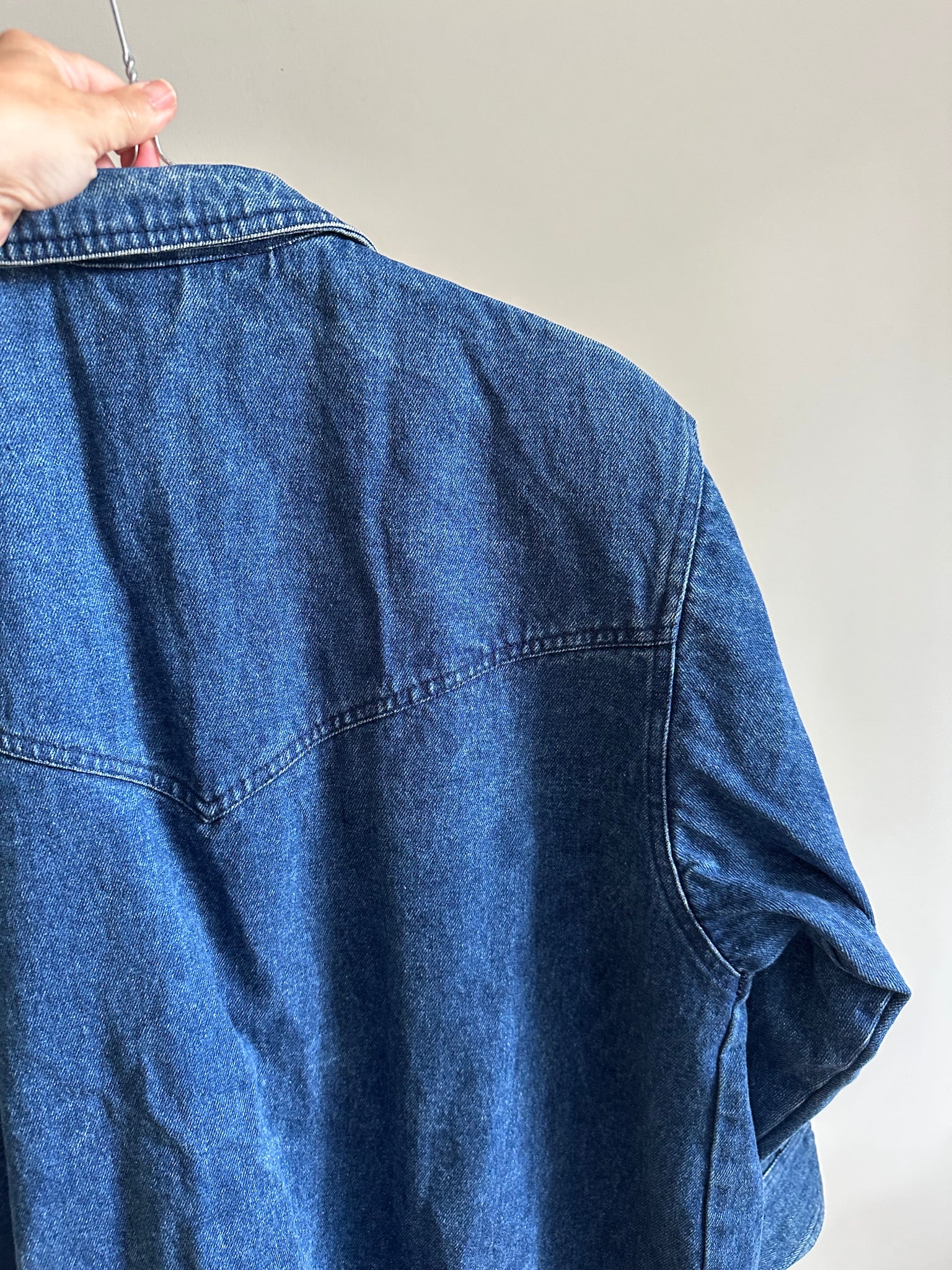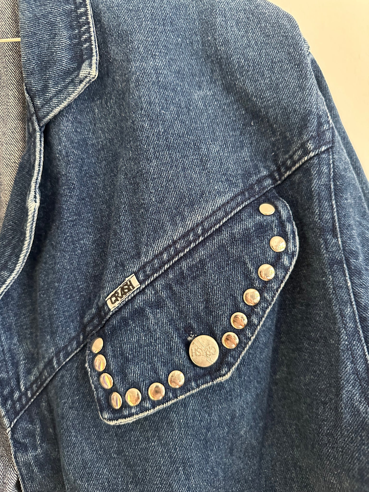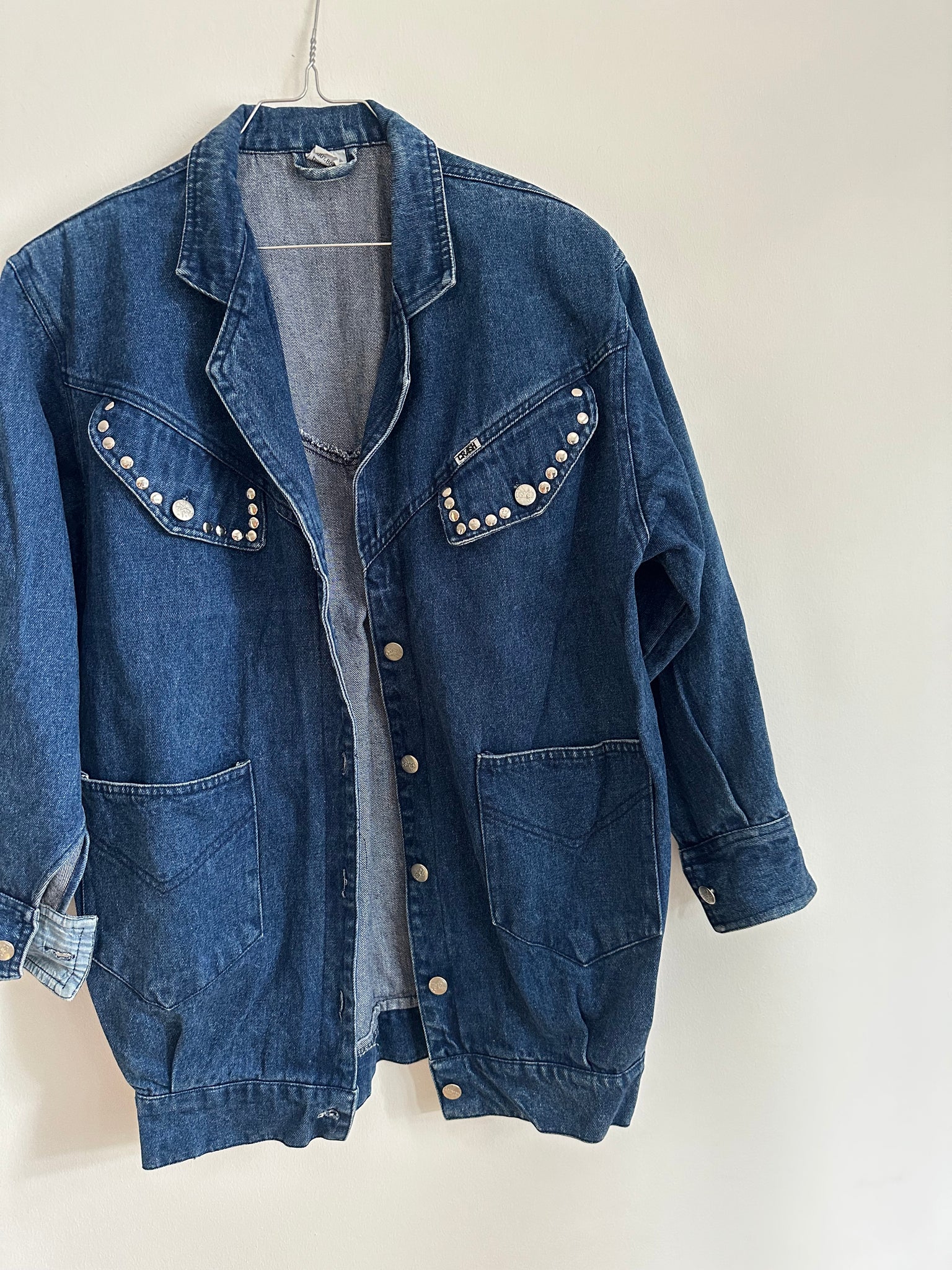 Gorgeous denim coat with stud details, big front pockets and shoulder pads. 80s.
