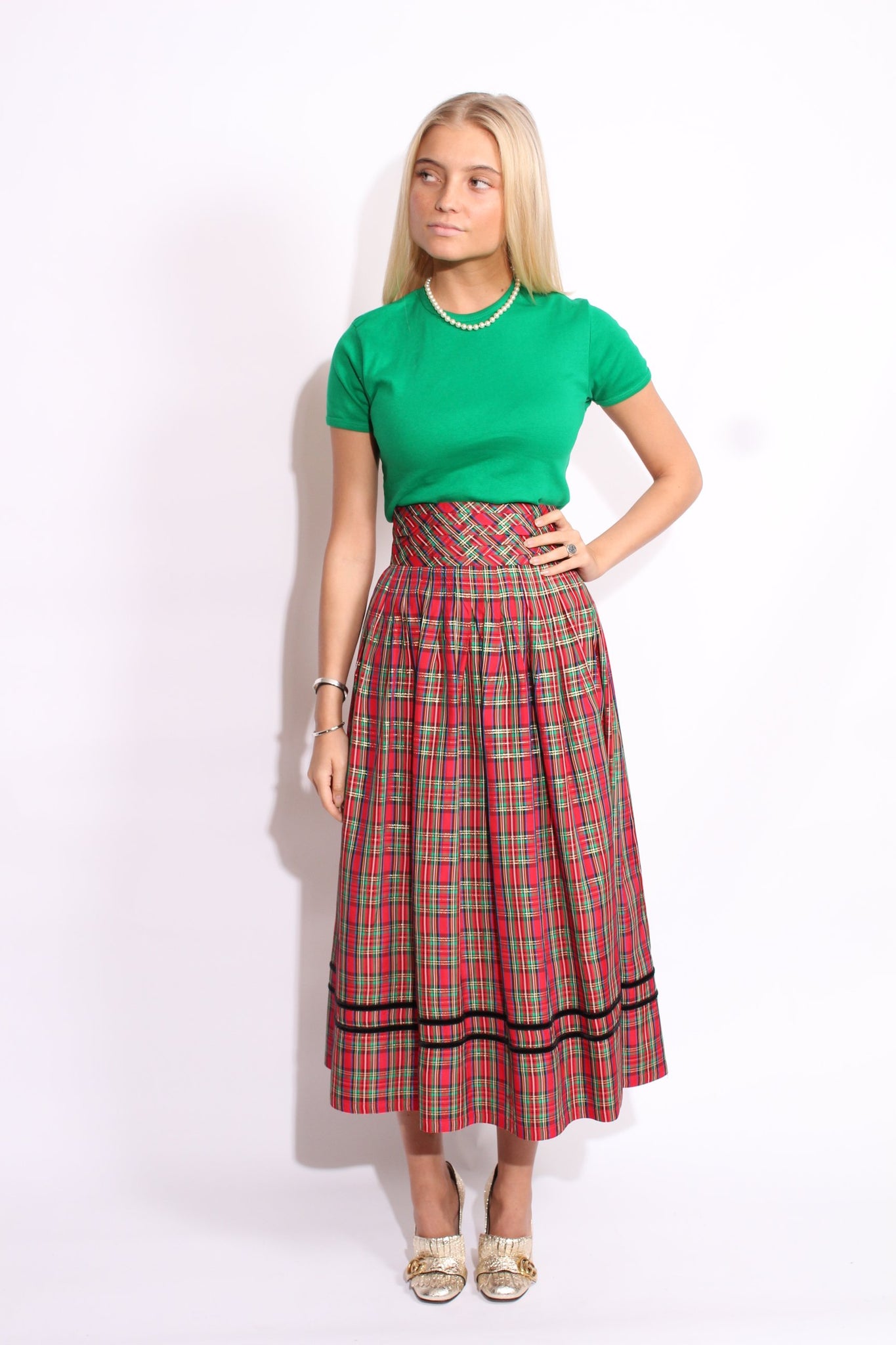 Beautiful tartan taffeta full midi skirt with pleated waist, velvet stripes and gold tread. Zipper in back.