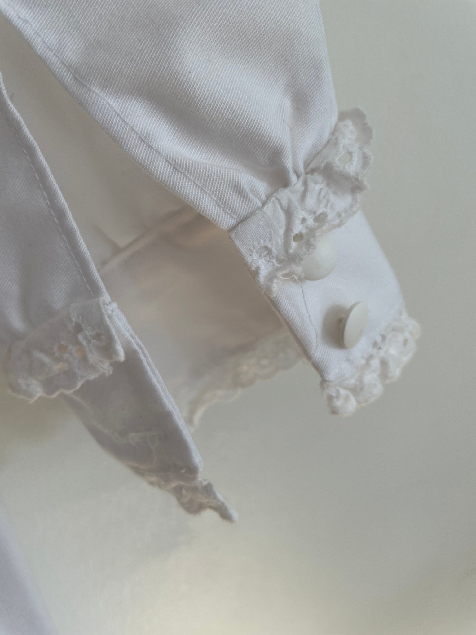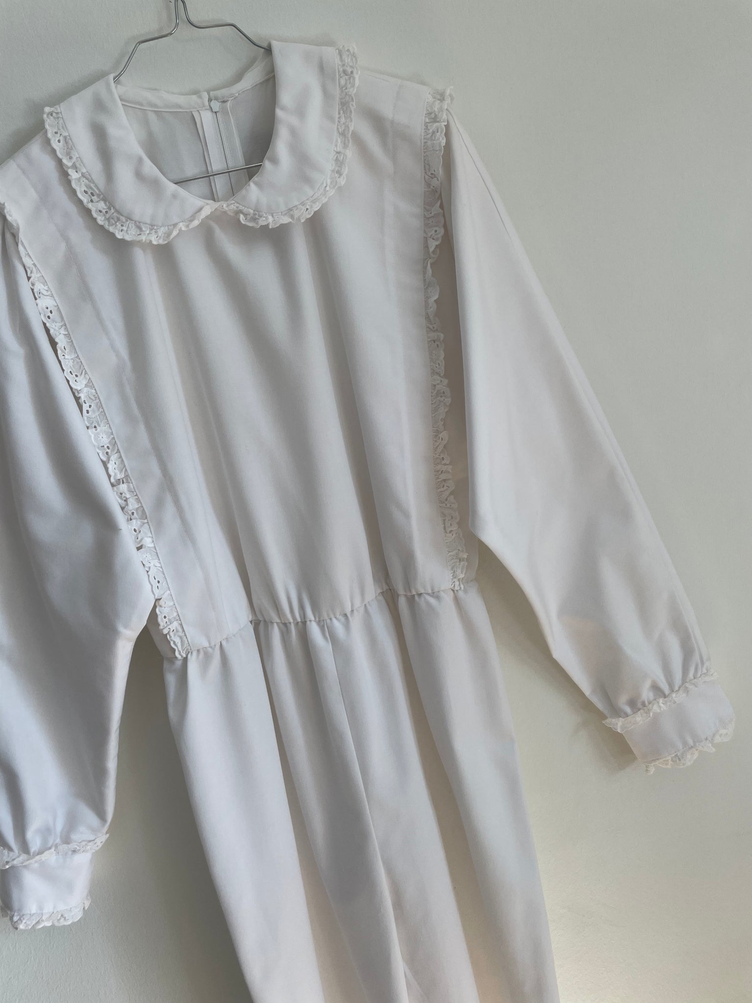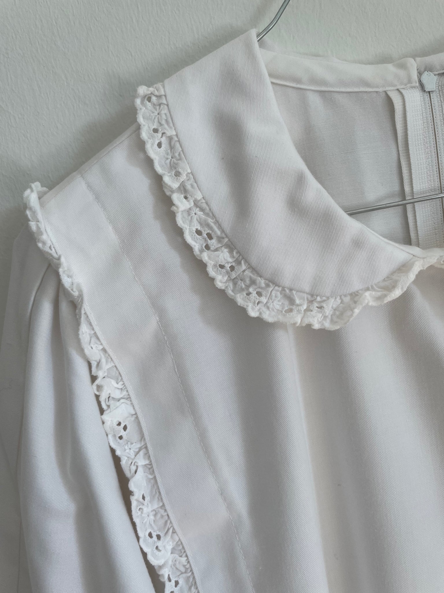 Cute white jumpsuit with Peter Pan collar. Batwing shape. Long zipper in back. Elastic waistline. Lace trim. From the 80s.