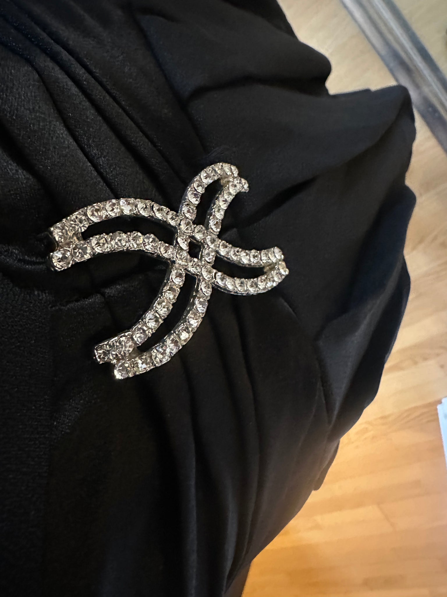 Beautiful black dress with satin and rhinestone details. Zipper in back of dress.