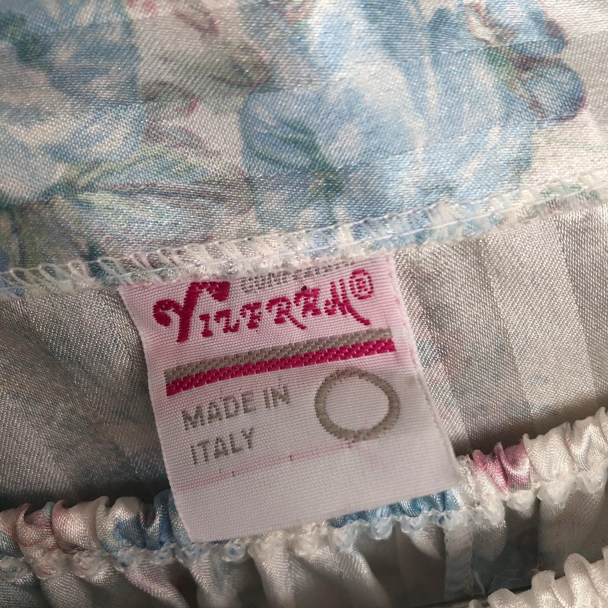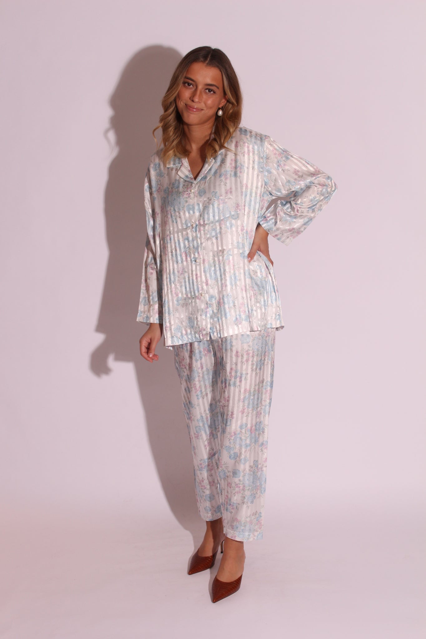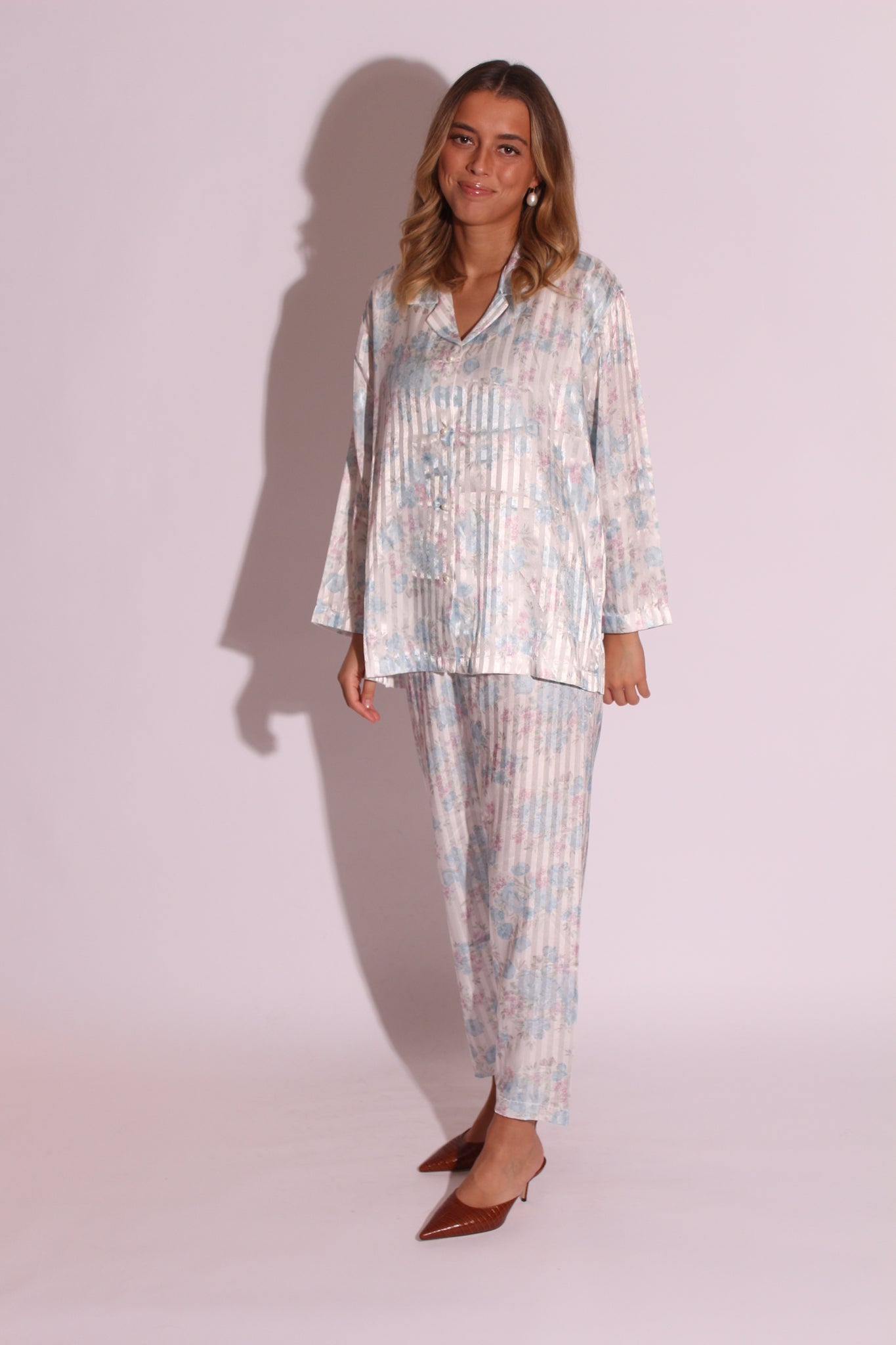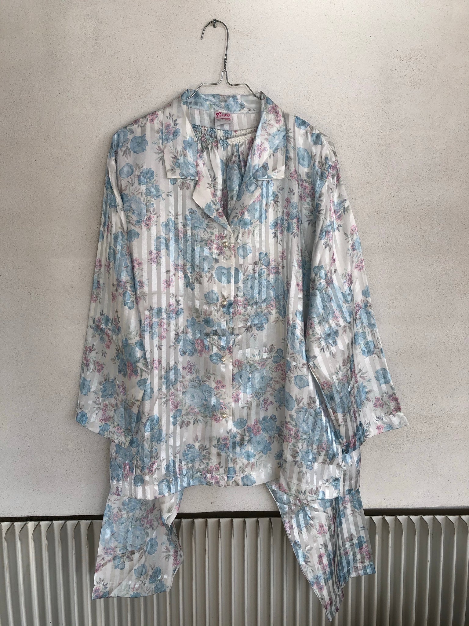 Prettiest pajamas suit ever. Light blue with pink floral print. Pearl buttons. Elastic waistband trousers.