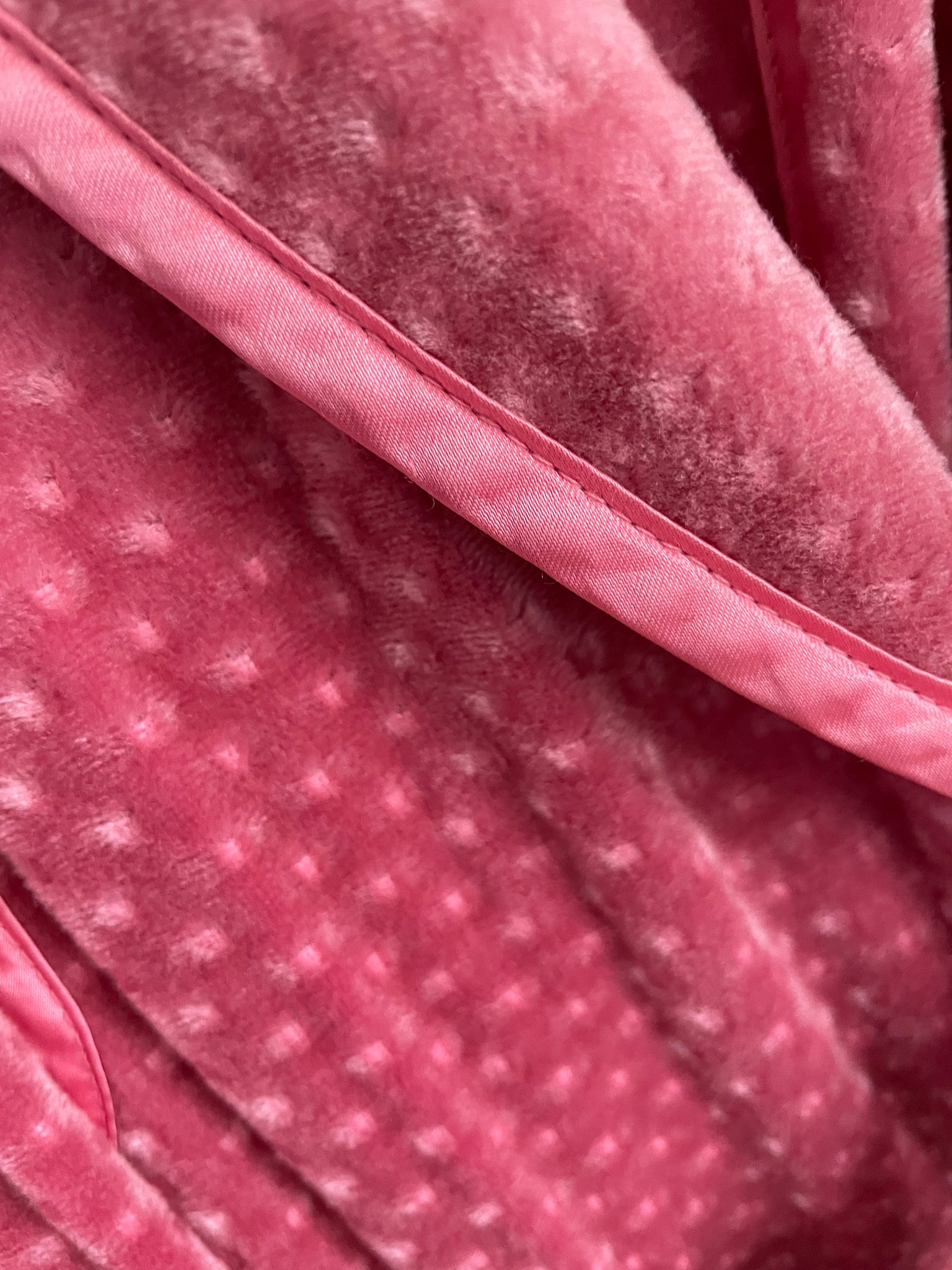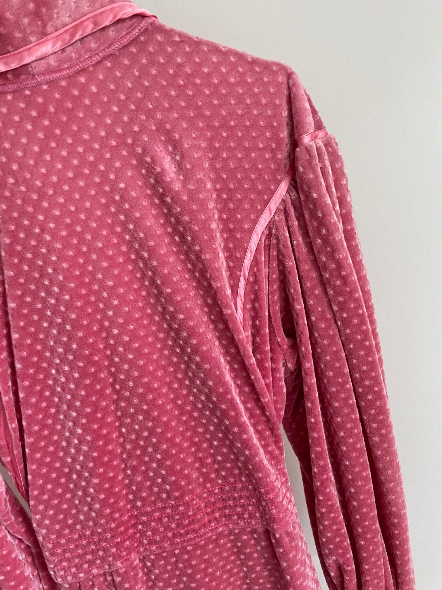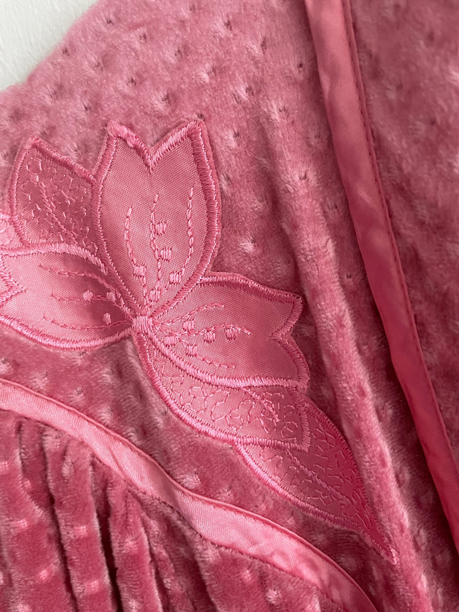 Gorgeous velvet house coat with appliqué , satin trim, volume sleeves. This will take you through all those cold winter days and nights. Use as a fall coat. As lounge wear on the couch or dress it up with a cool heel for that winter party.
